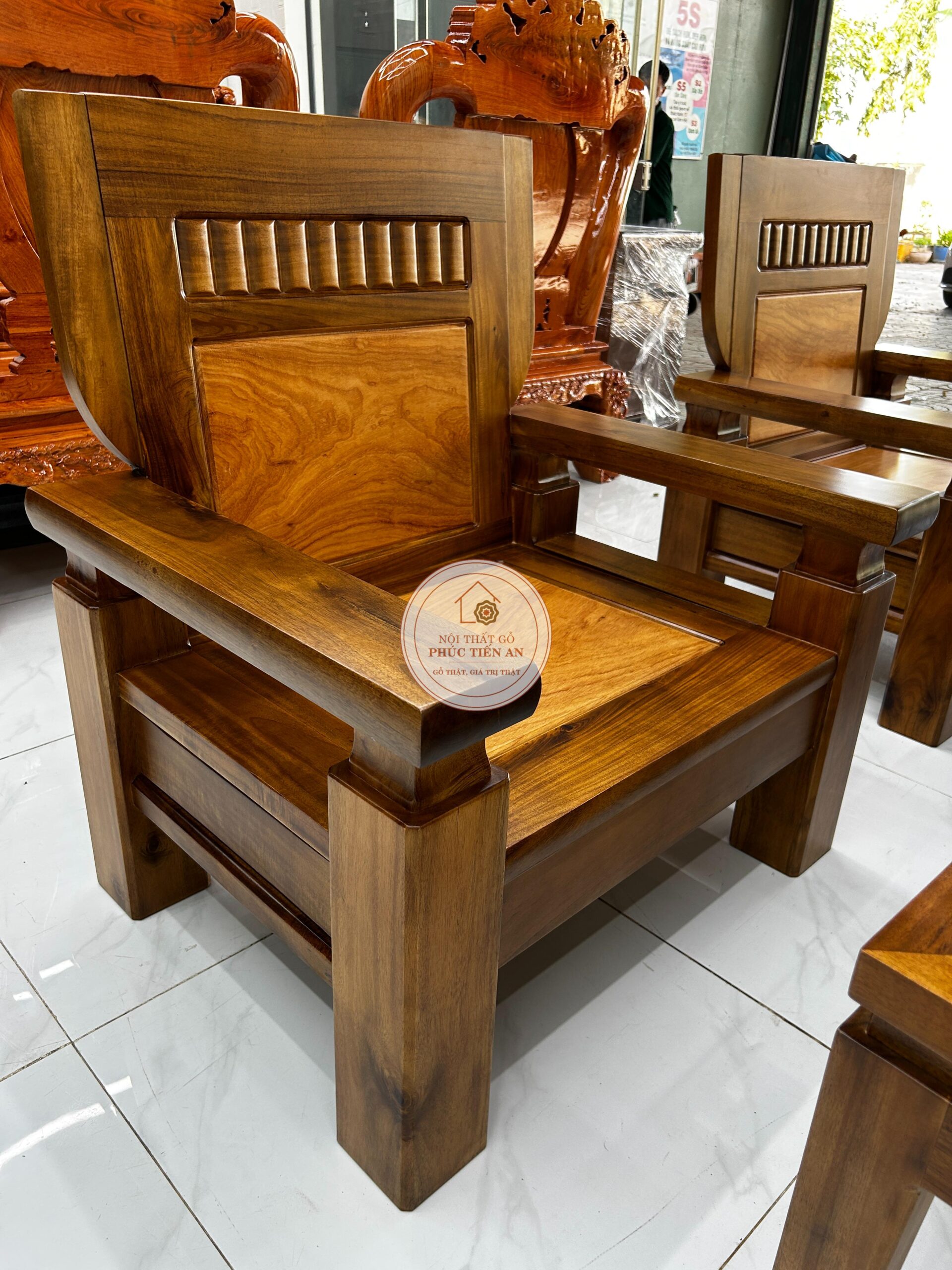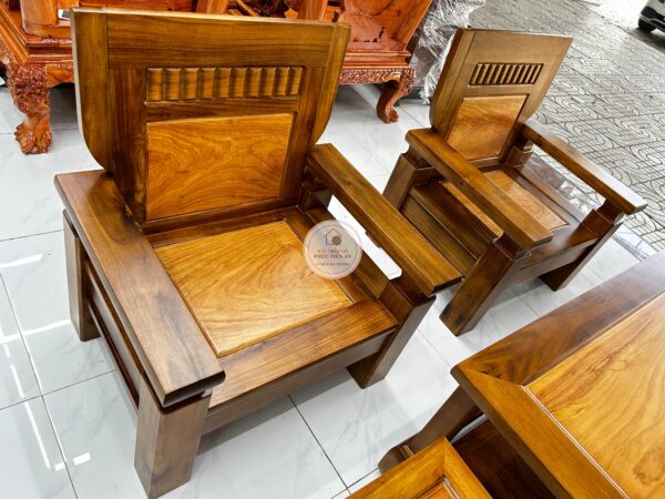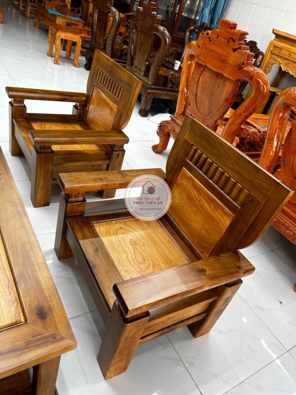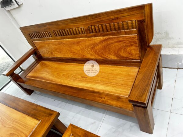 Bộ sa lông gỗ Tràm mặt Gõ được thiết kế vuông vức, khỏe khoắn, các đường nét gọn gàng mang phong cách hiện đại.