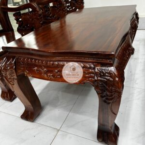 Mặt bàn liền nguyên tấm, độ dày ấn tượng, phô diễn toàn bộ vân gỗ tự nhiên độc đáo – mỗi đường vân tạo nên mỗi Bộ Salon Gỗ – Triện 12 Tó Đào Tay Nghê Gỗ Me Tây có nét nghệ thuật riêng biệt không trùng lặp.