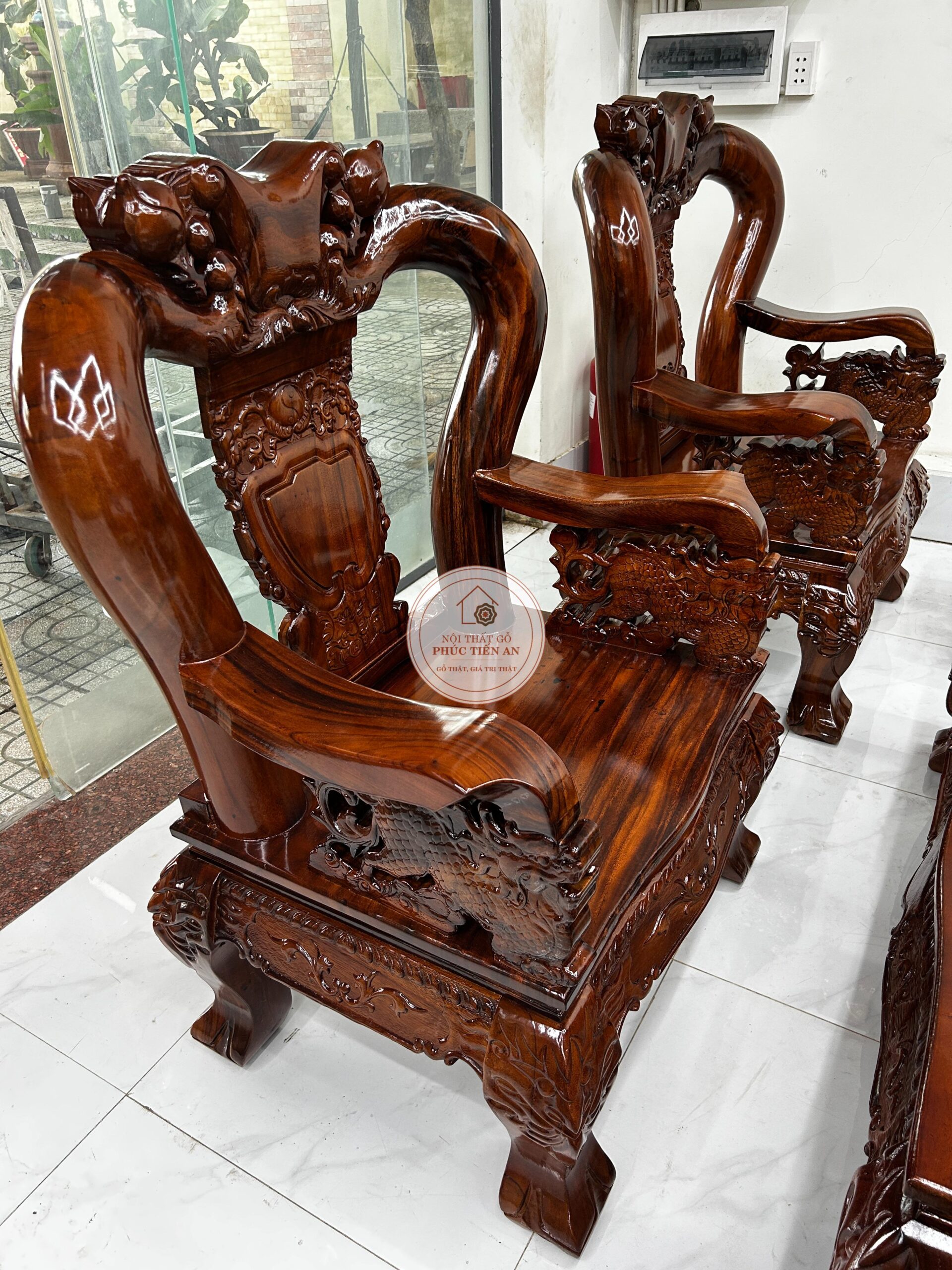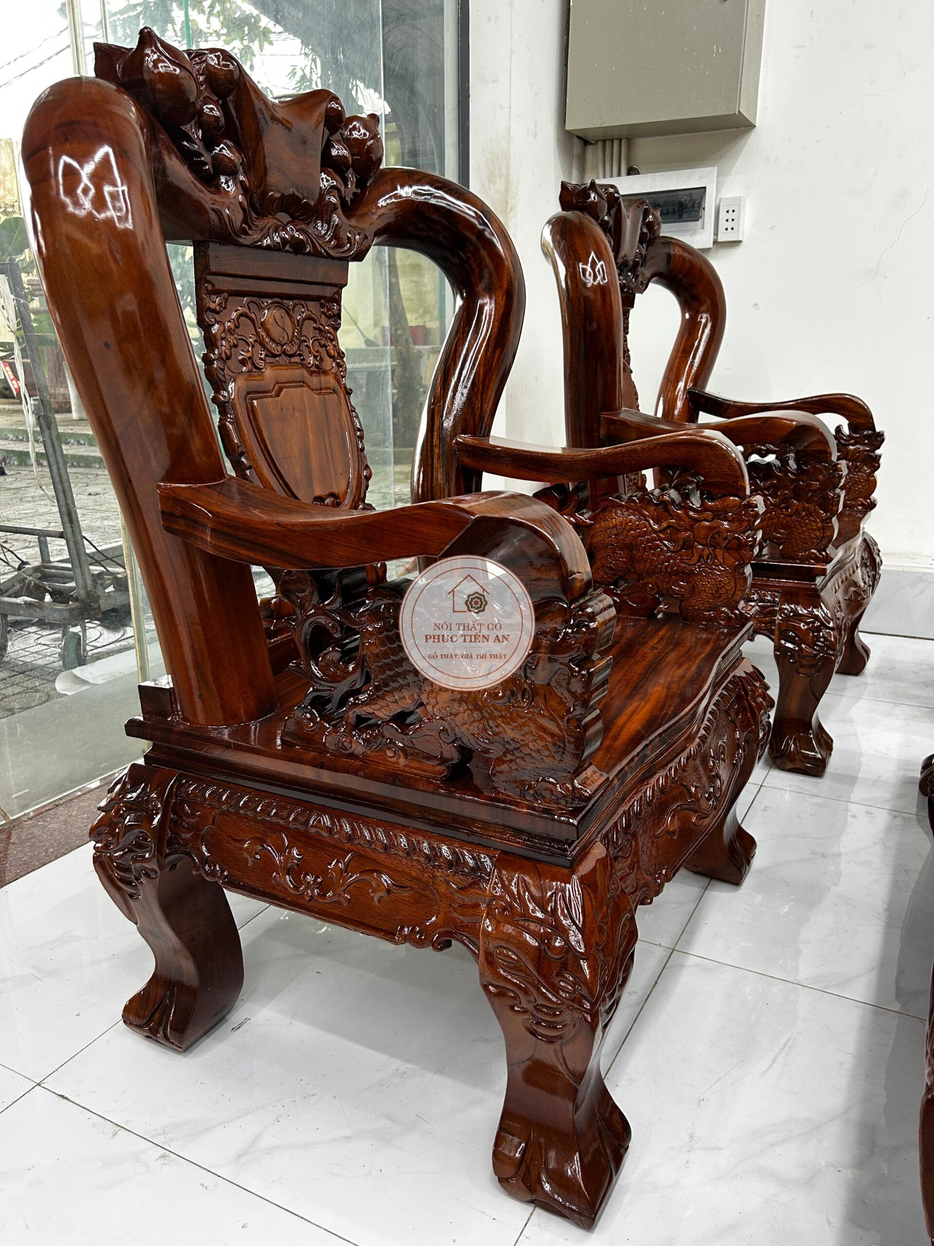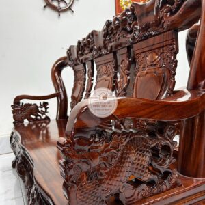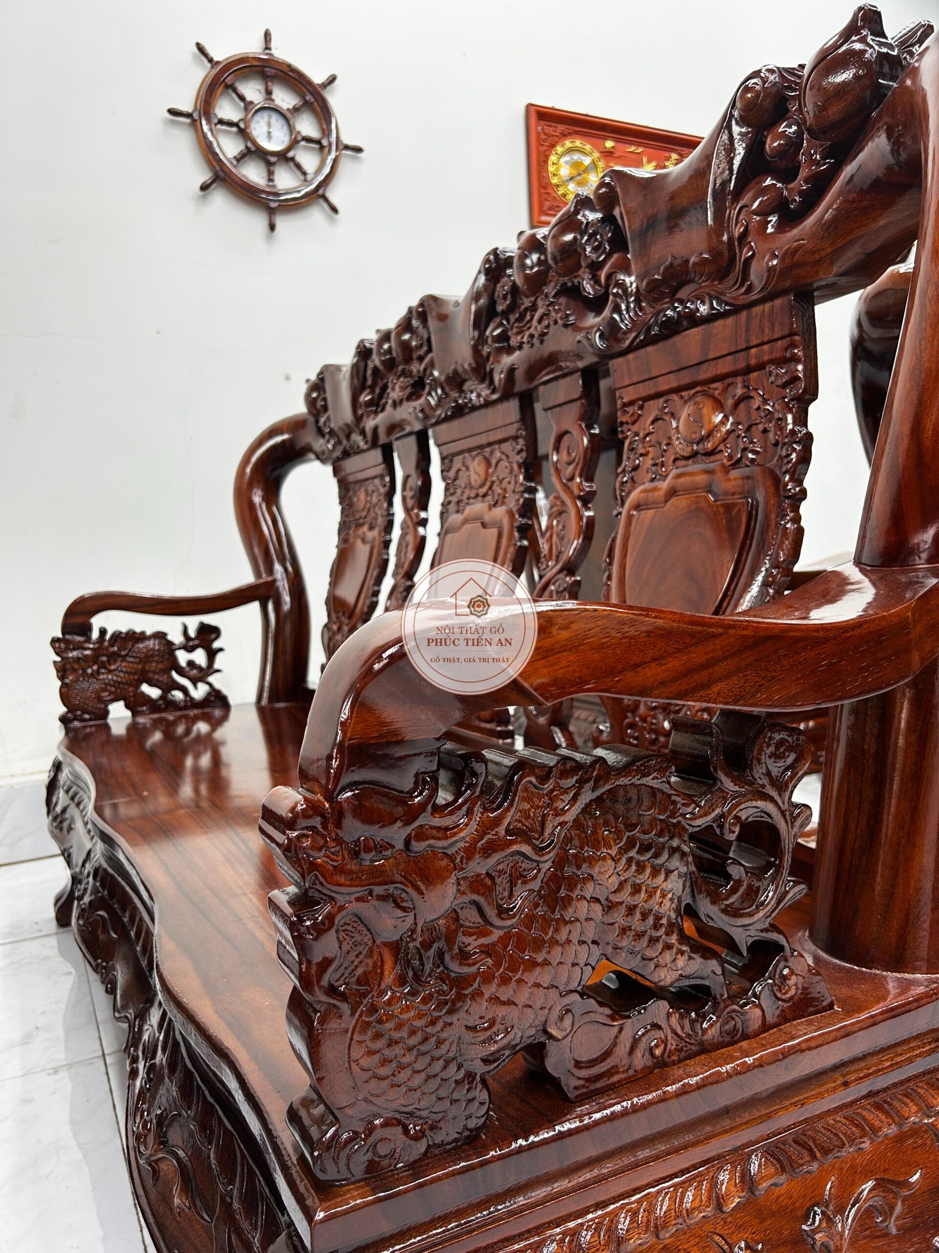 Bộ Salon Gỗ – Triện 12 Tó Đào Tay Nghê Gỗ Me Tây có Tay ghế chạm nghê sắc nét tượng trưng cho quyền uy, sức mạnh và sự bảo vệ may mắn cho gia chủ.