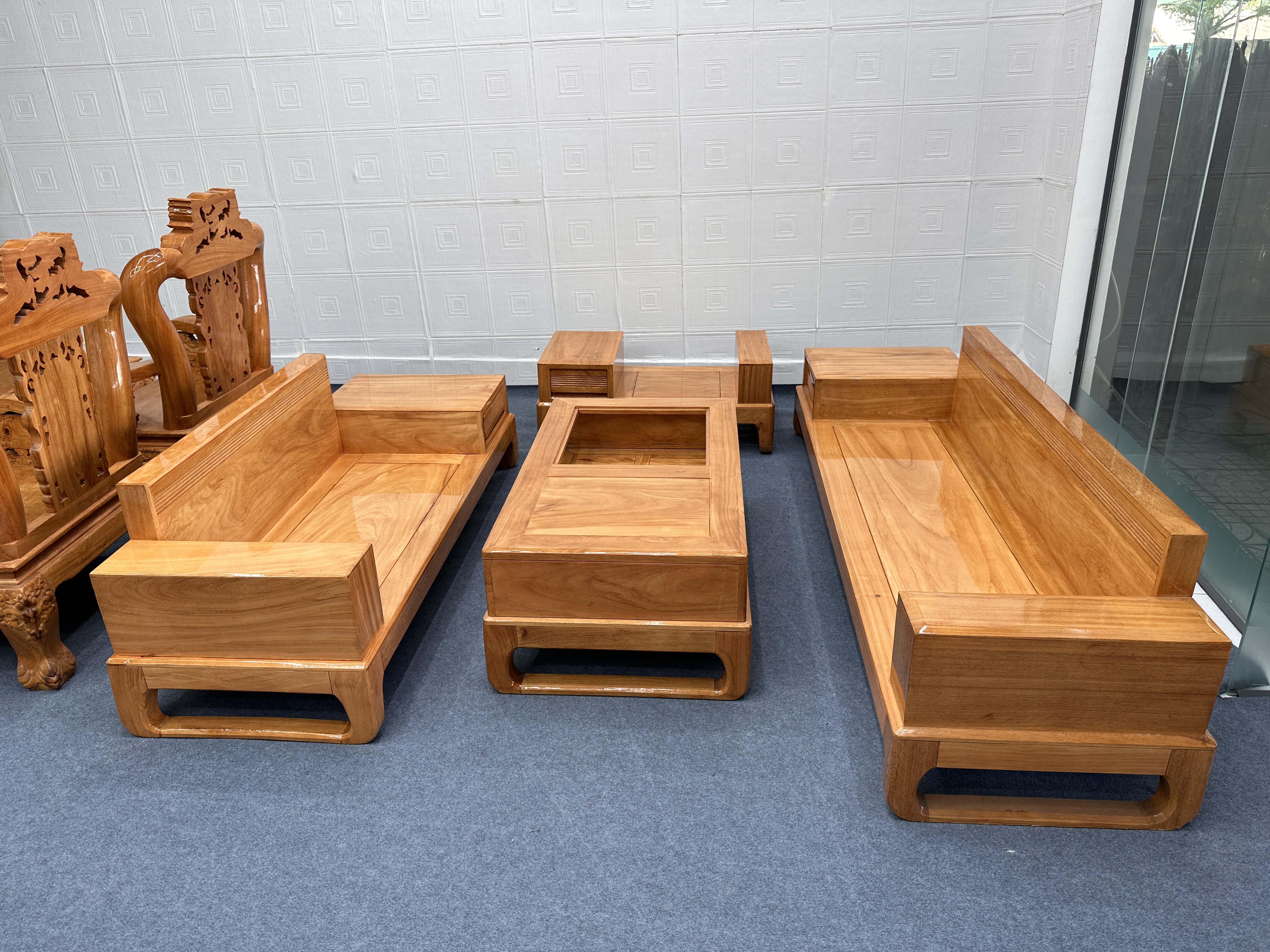 - Bộ sofa gỗ/ góc gỗ gõ 2 băng được thiết kế với những đường nét mềm mại, tinh xảo, kết hợp giữa phong cách hiện đại và truyền thống. Màu sắc tự nhiên của gỗ gõ cùng với vân gỗ độc đáo tạo nên điểm nhấn ấn tượng cho không gian.