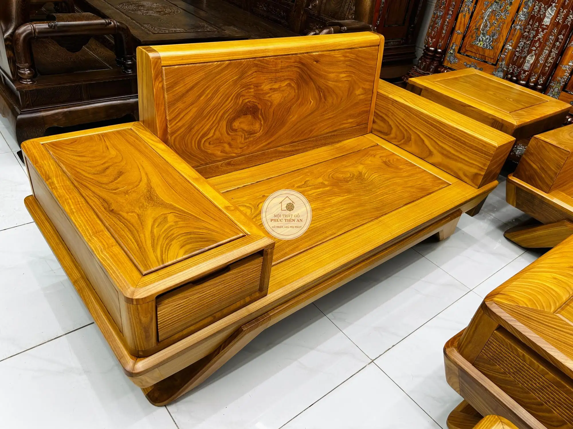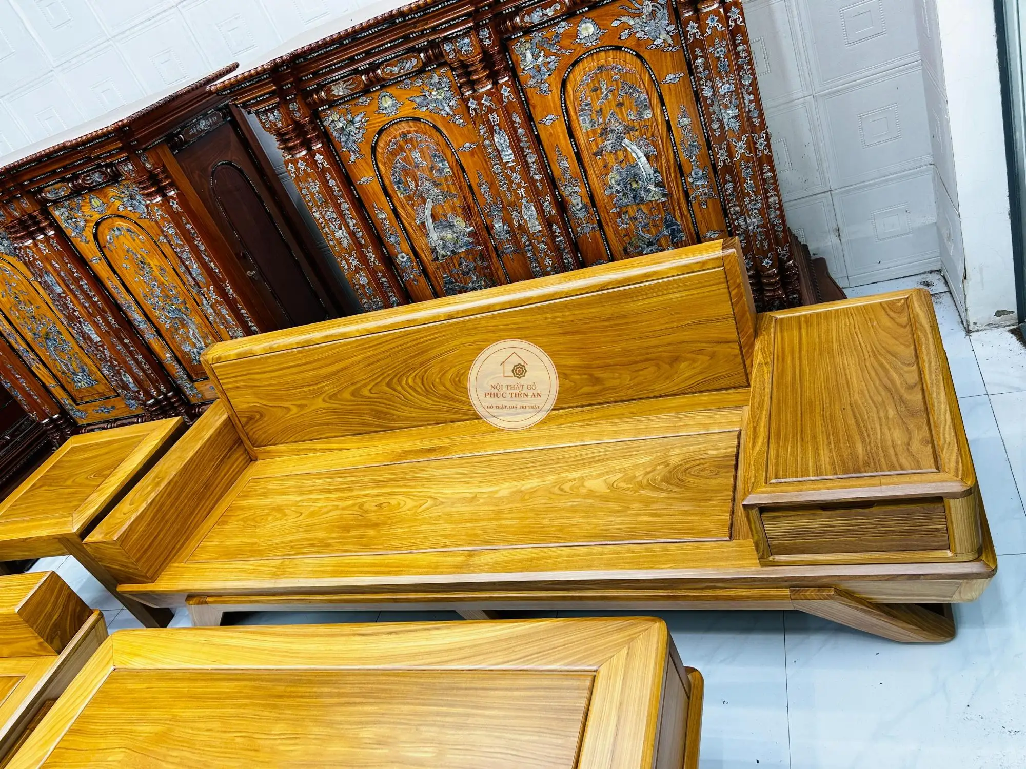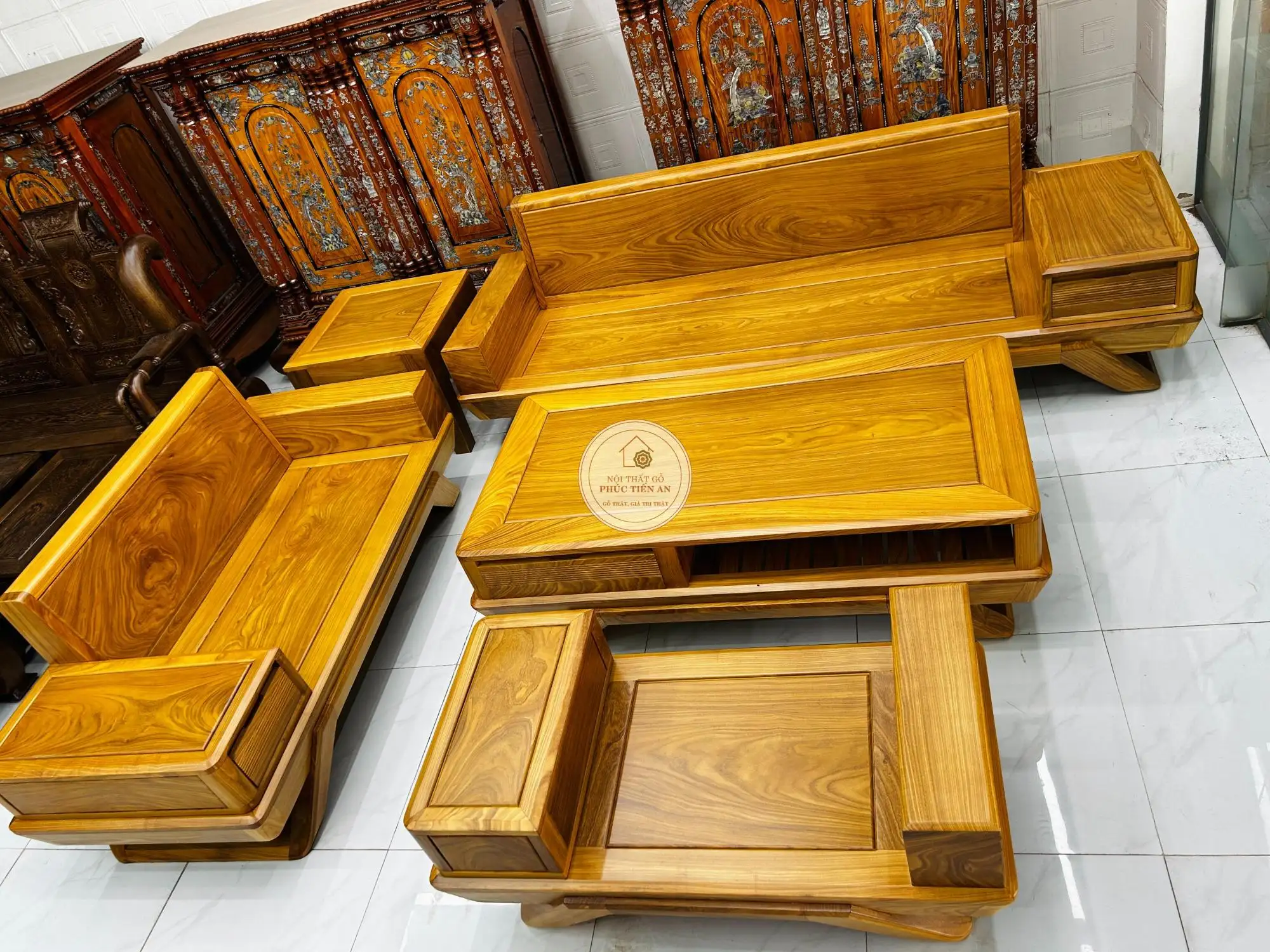 Bộ Salon phòng khách – Salon 2 băng gỗ Cẩm vàng sử dụng chất gỗ đẹp, màu vàng óng tự nhiên, đường vân sắc nét nổi bật trên từng bề mặt, mang đến vẻ sang trọng và giá trị thẩm mỹ cao.